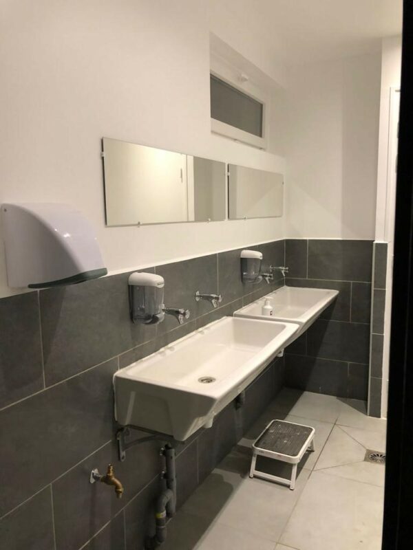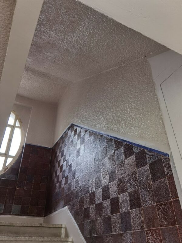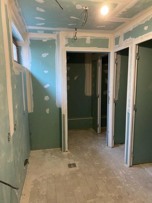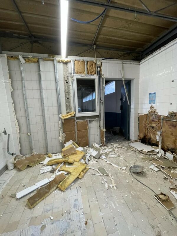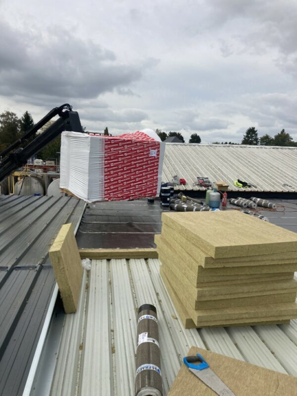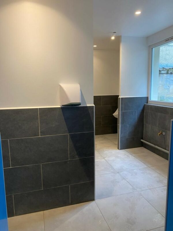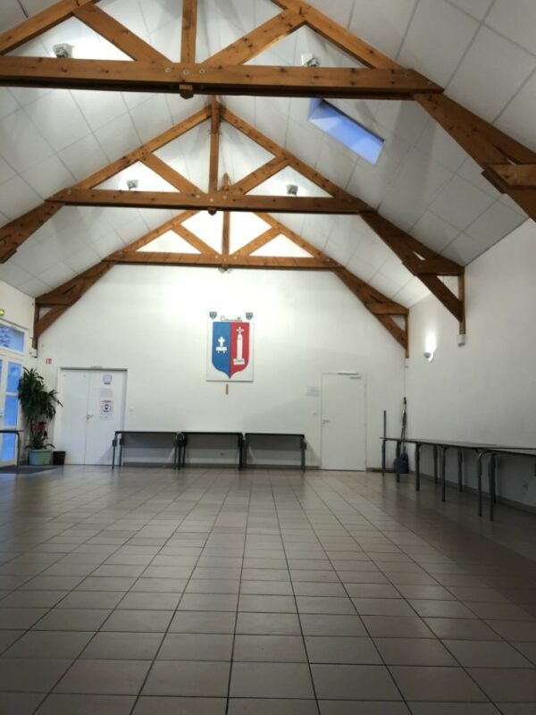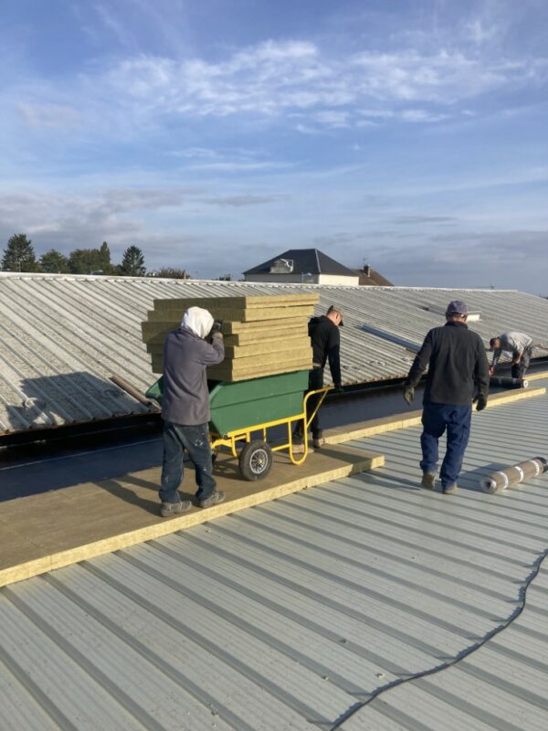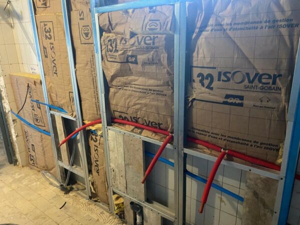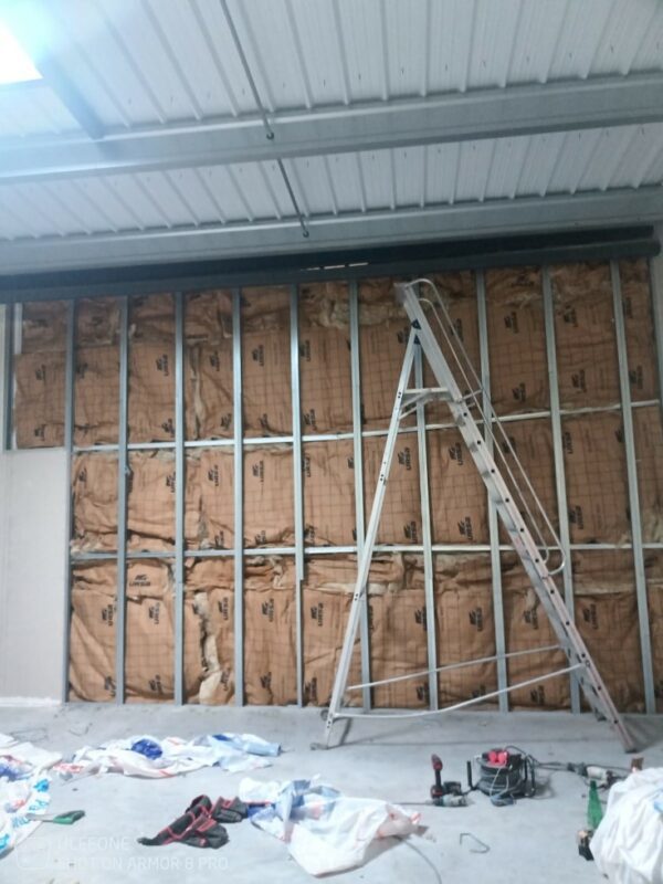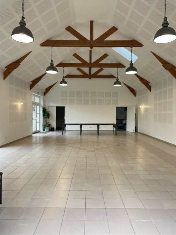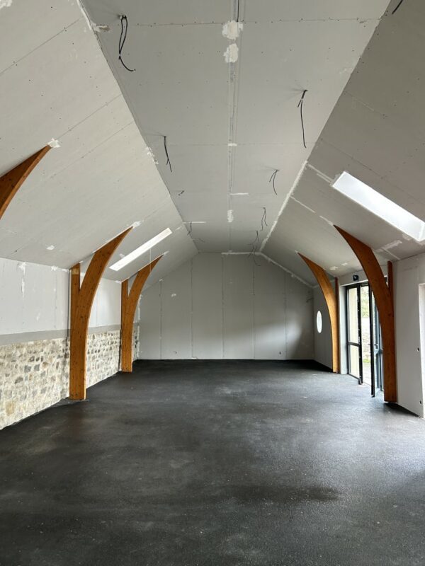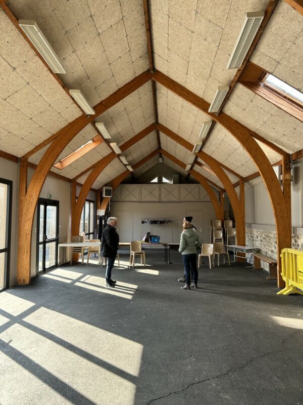 Isolation des murs et rampants en laine de bois (isolants biosourcés) et création de surfaces absorbantes pour améliorer le confort acoustique de la salle.