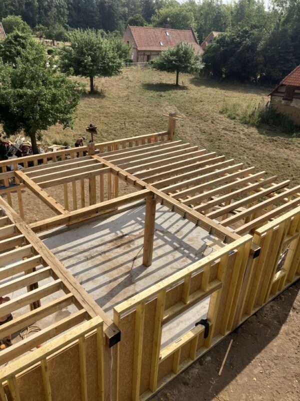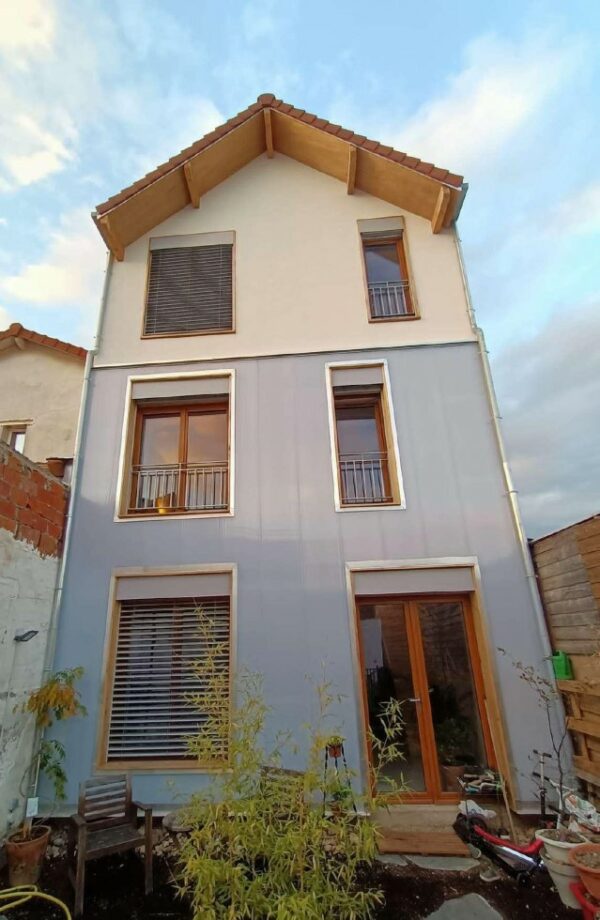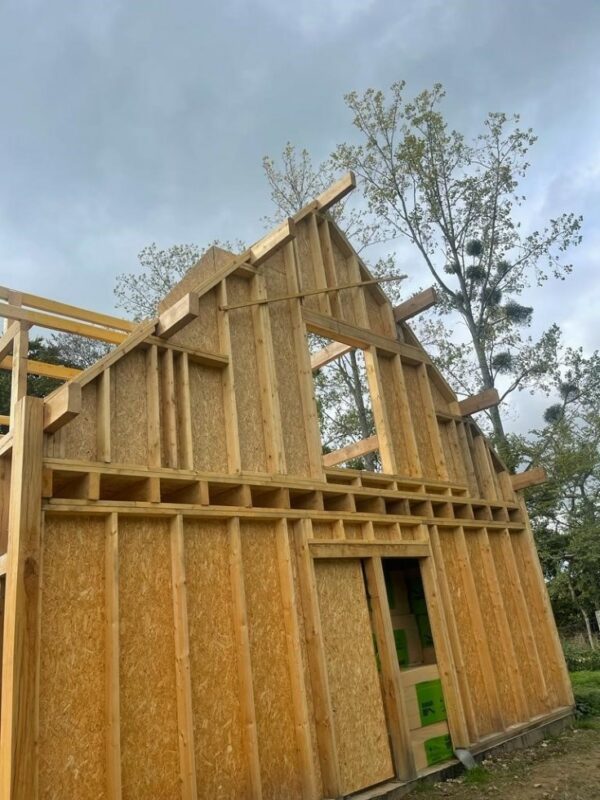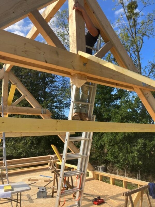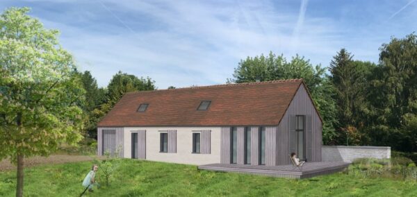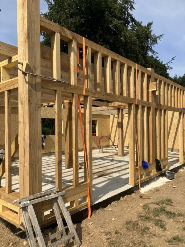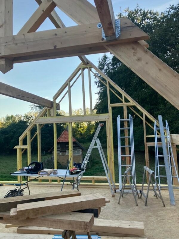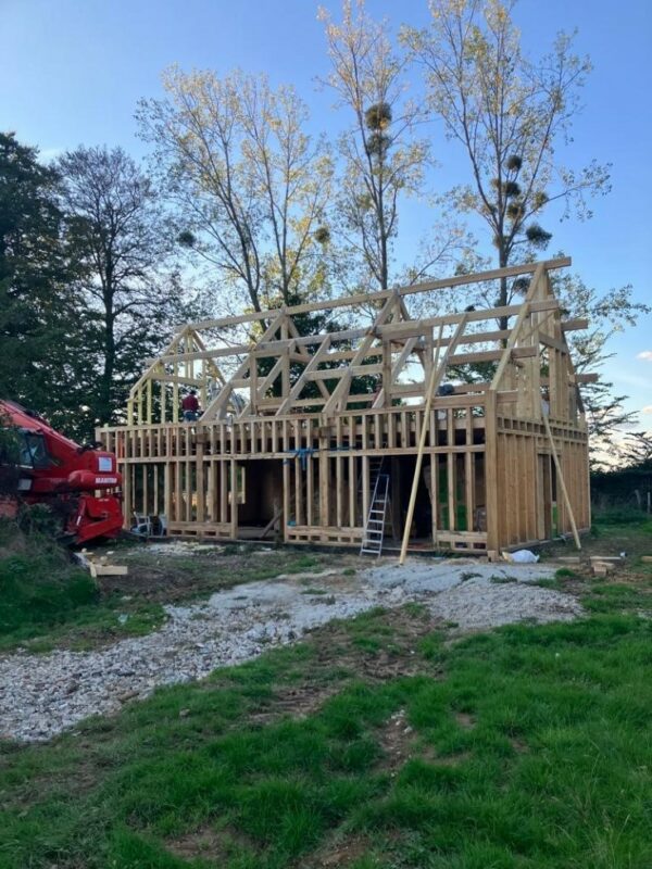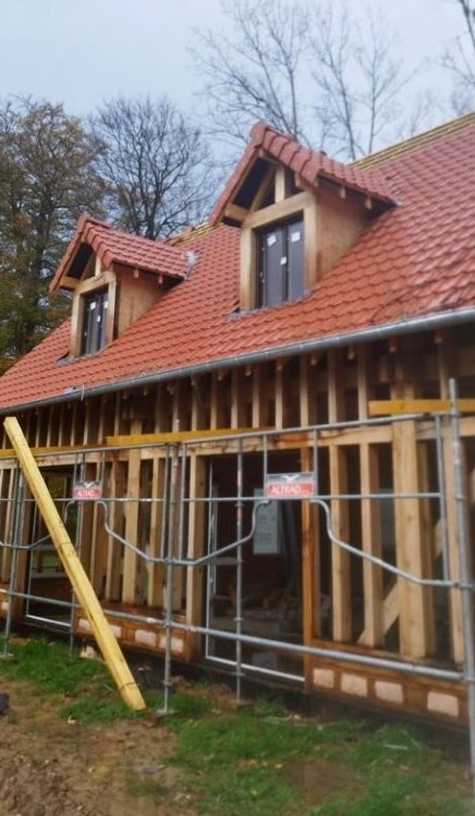 À Dieppe, réalisation d’une maison en ossature bois avec deux façades en colombage traditionnel, découpe et assemblage à la main, remplissage des colombages en béton de chanvre. Les deux autres façades sont en ossature bois classique habillées d’un bardage bois de masse.