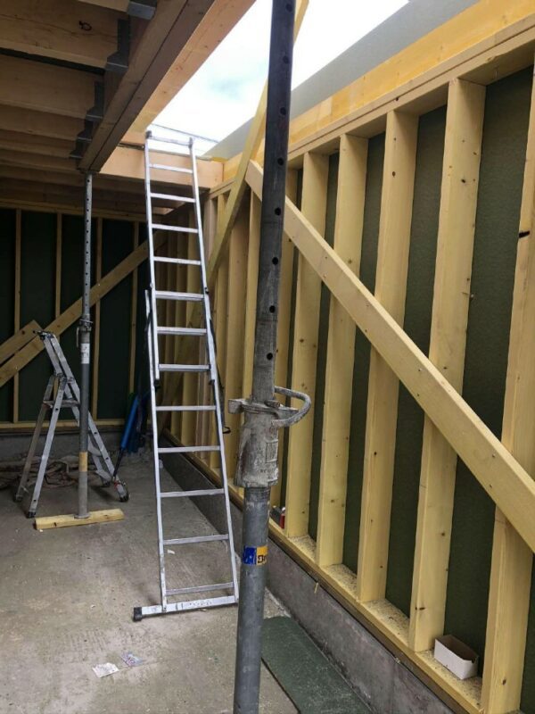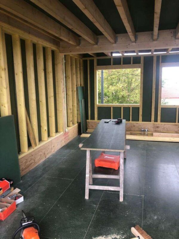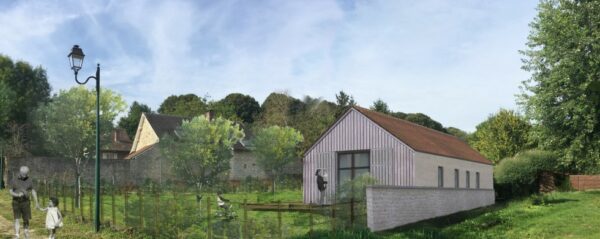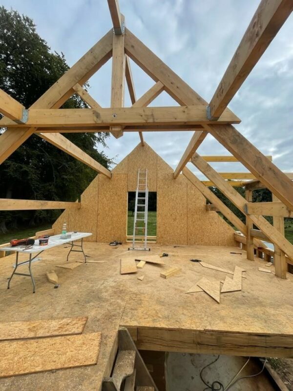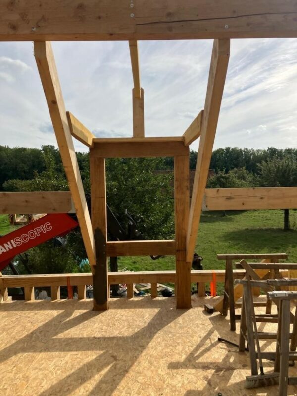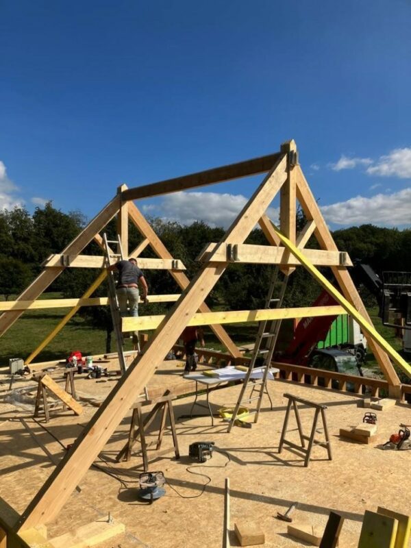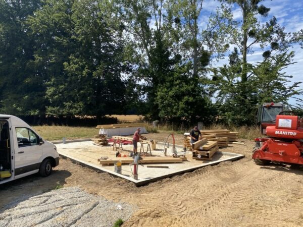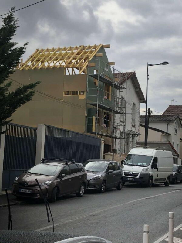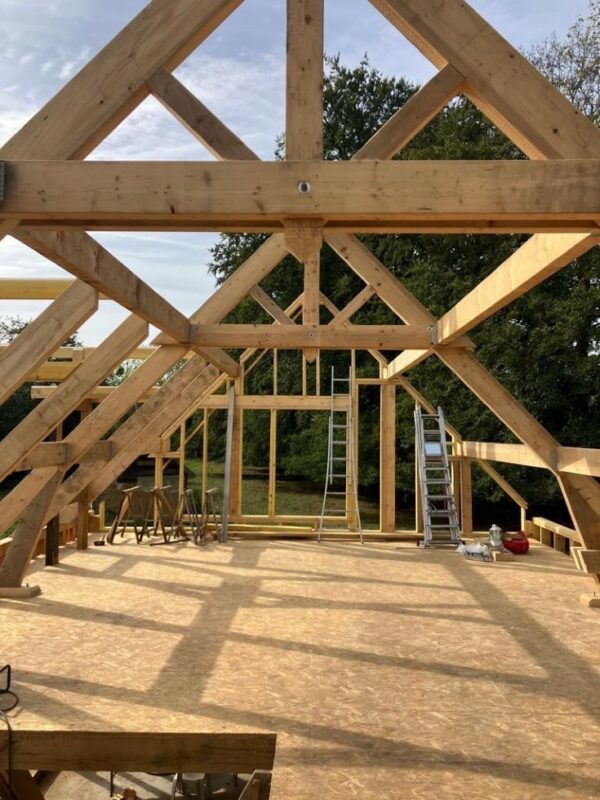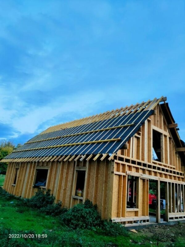 À Dieppe, réalisation d’une maison en ossature bois avec deux façades en colombage traditionnel, découpe et assemblage à la main, remplissage des colombages en béton de chanvre. Les deux autres façades sont en ossature bois classique habillées d’un bardage bois de masse.